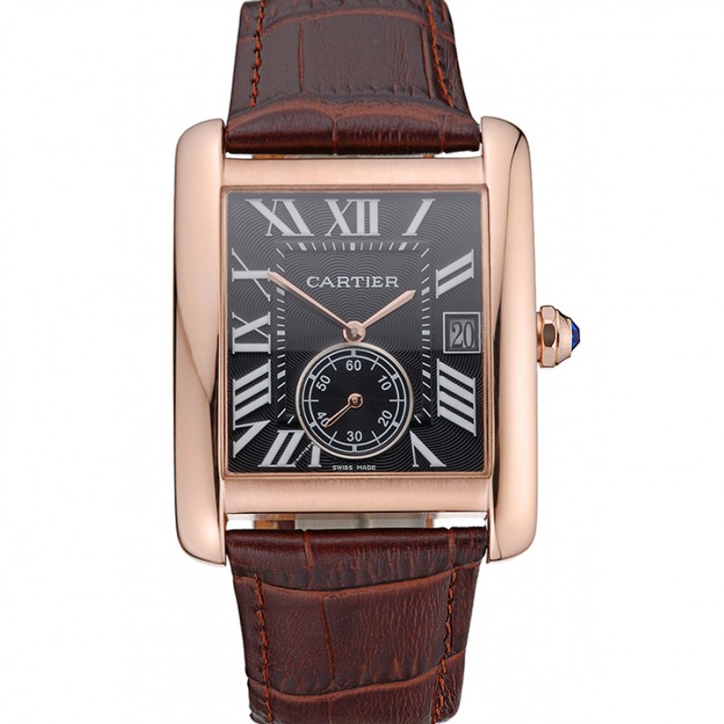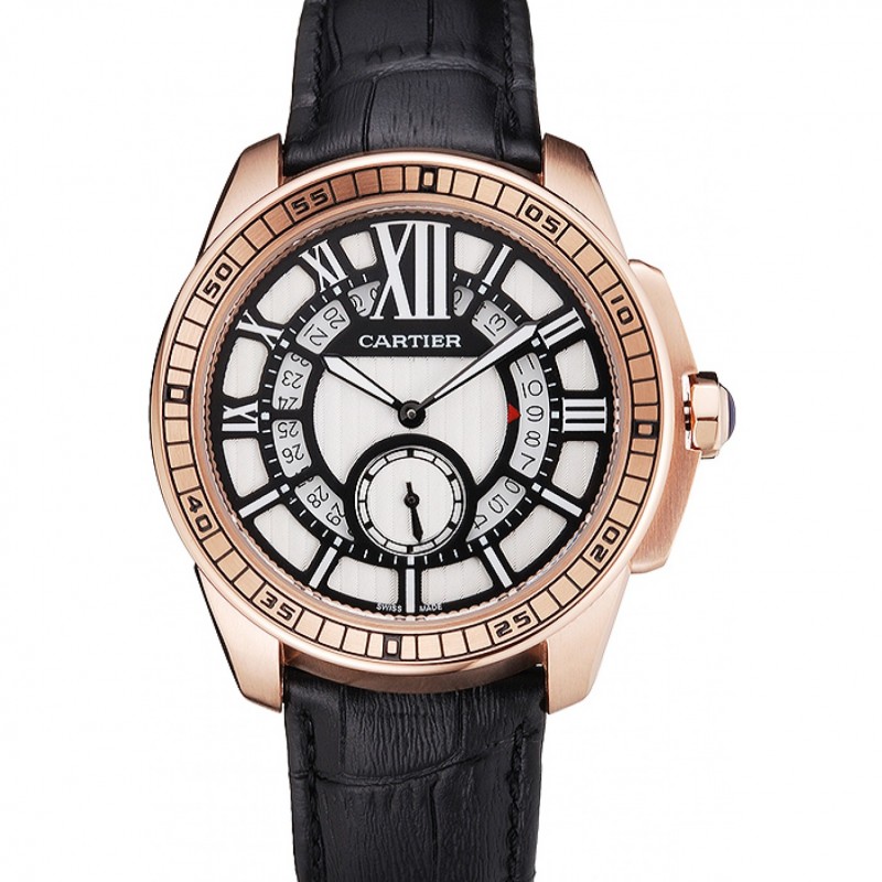 Barato Cartier Calibre De Cartier pequeños segundos y negro Negro Dial correa de cuero de la caja de oro rosa Negro