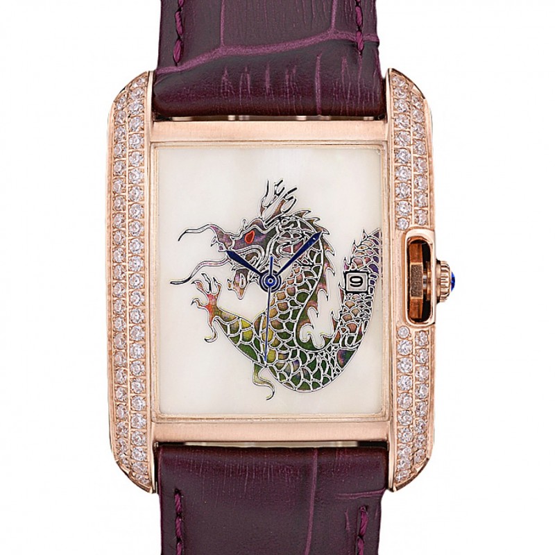 Cartier Tank Inglesa White Dragon reloj de diamantes pulsera de cuero del oro púrpura del caso