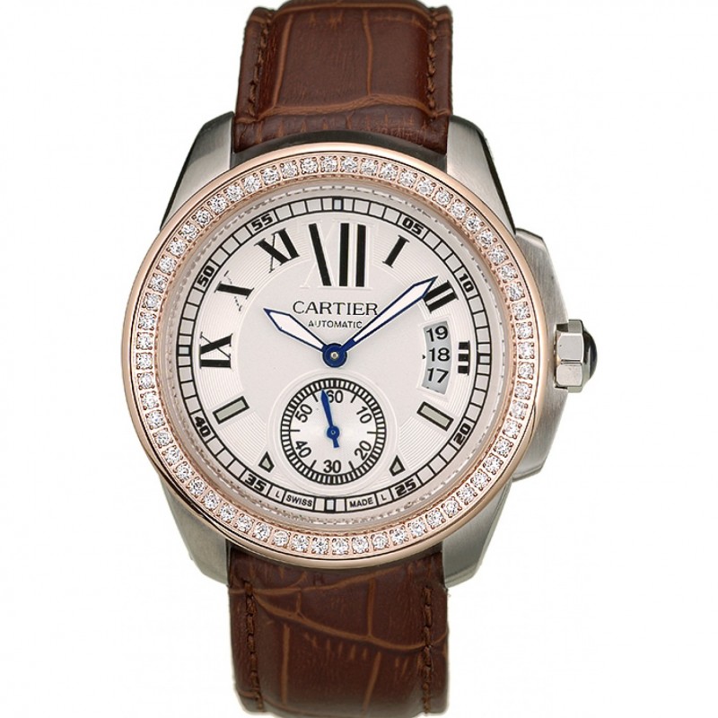 AAA Réplicas Relojes Cartier Calibre blanca reloj de diamantes de dos tonos pulsera de la caja del cuero de Brown