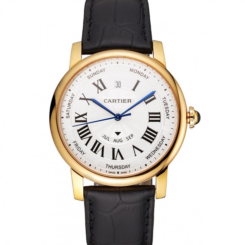 Calendario suizo Cartier Rotonde Anual esfera blanca correa de cuero de la caja Negro Oro