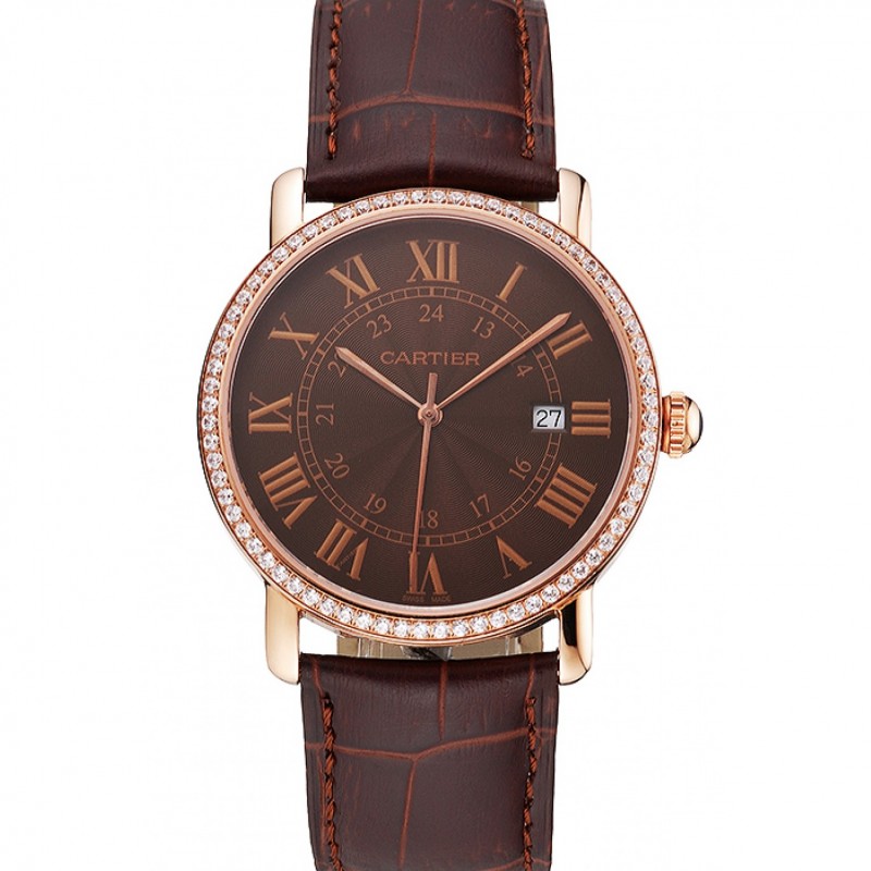 Alta calidad Cartier Ronde Solo Brown Dial correa de cuero del diamante del bisel de oro rosa caja Brown