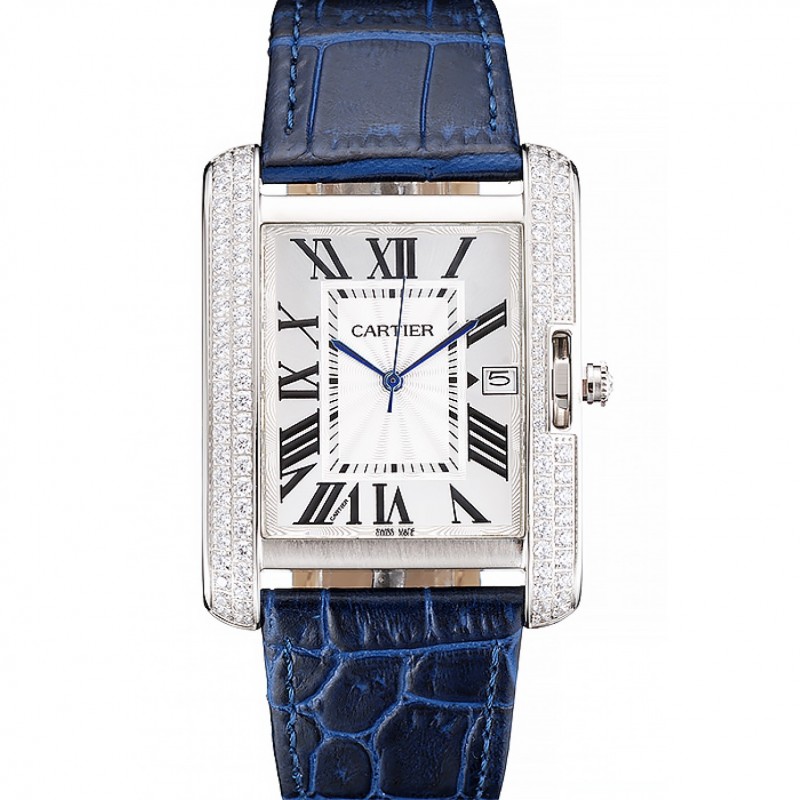 Cartier Tank Inglesa 36mm reloj de diamantes blancos pulsera de cuero de la caja de acero azul