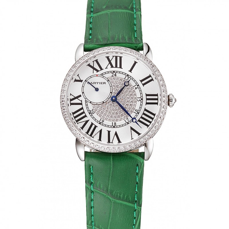 Cartier Ronde Louis plata diamante Caso esfera blanca pulsera de cuero verde 1454012