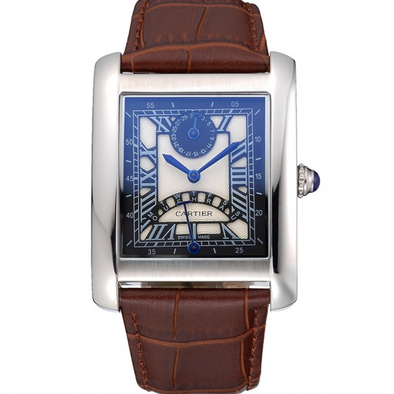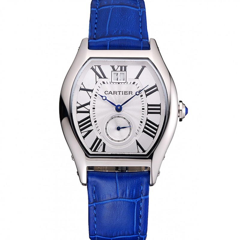 Cartier Tortue grande Fecha esfera blanca correa de cuero de la caja azul de acero inoxidable