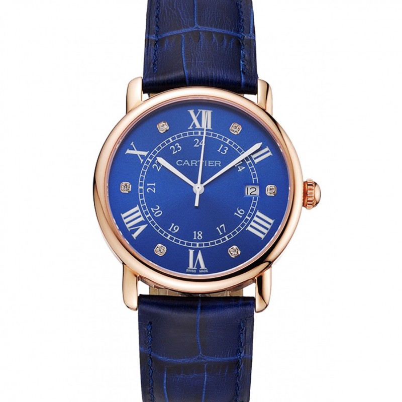 Gama alta Réplicas Relojes Cartier Ronde Solo Azul Dial correa de cuero del diamante marcas de la hora de oro rosa caja azul