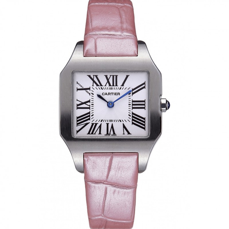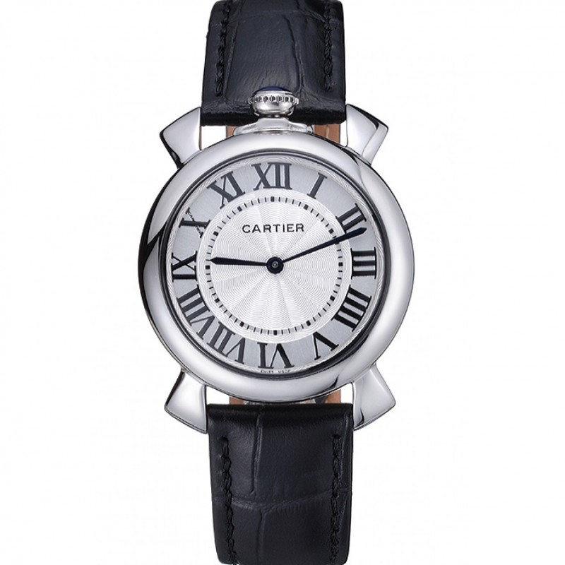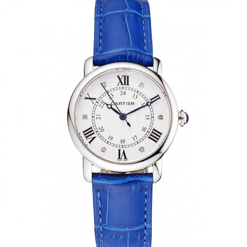 Barato Cartier Ronde Blanco Dial correa de cuero de diamante marcas de la hora azul caja de acero inoxidable