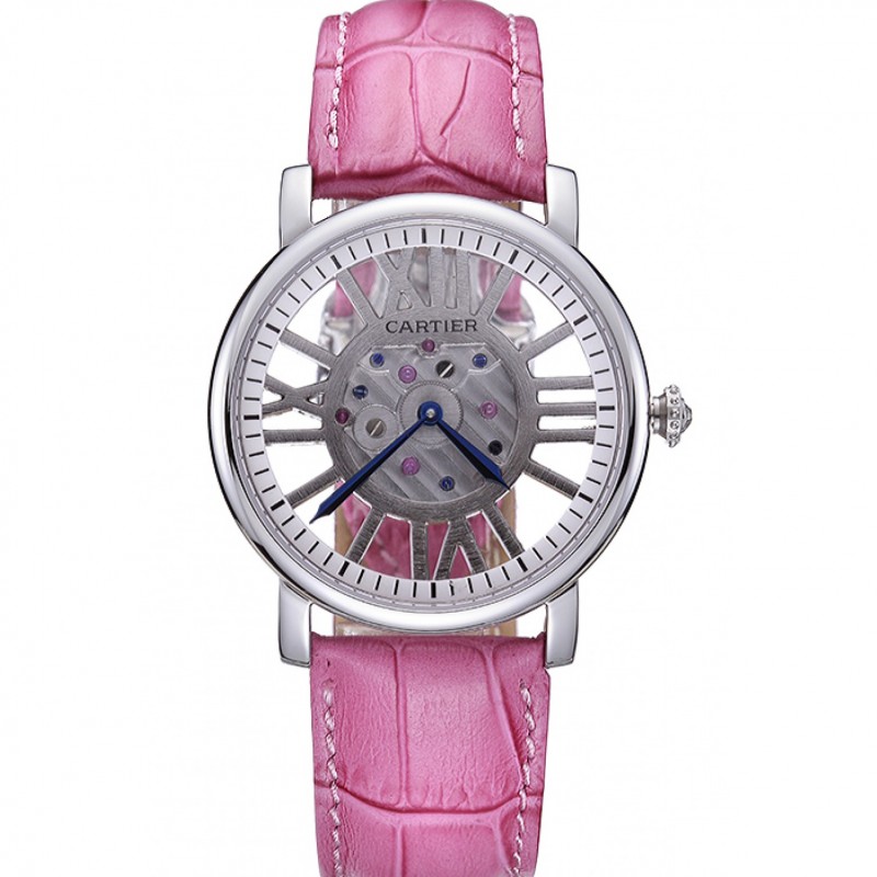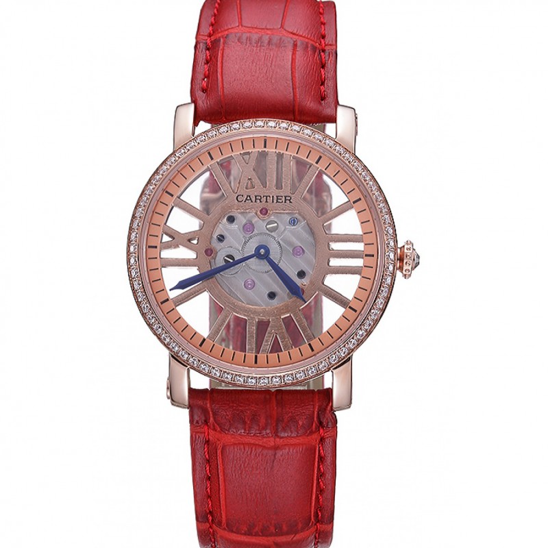 Cartier de lujo esquelético del reloj con bisel de oro rosa y Brown banda de cuero 621557