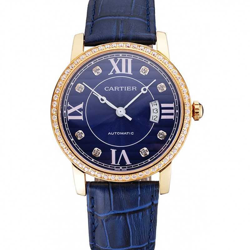 Suizo Cartier Ronde Solo Azul Dial correa de cuero del diamante Caja Oro Azul