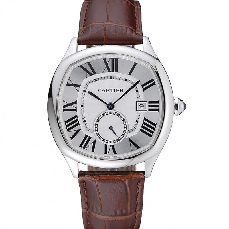Lujo Réplicas Relojes Cartier Drive De Cartier Blanco Dial de plata del caso Brown pulsera de cuero 1454210