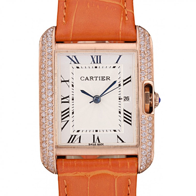Cartier Tank Inglesa 30mm reloj de diamantes blancos Pulsera cuero del oro naranja caso