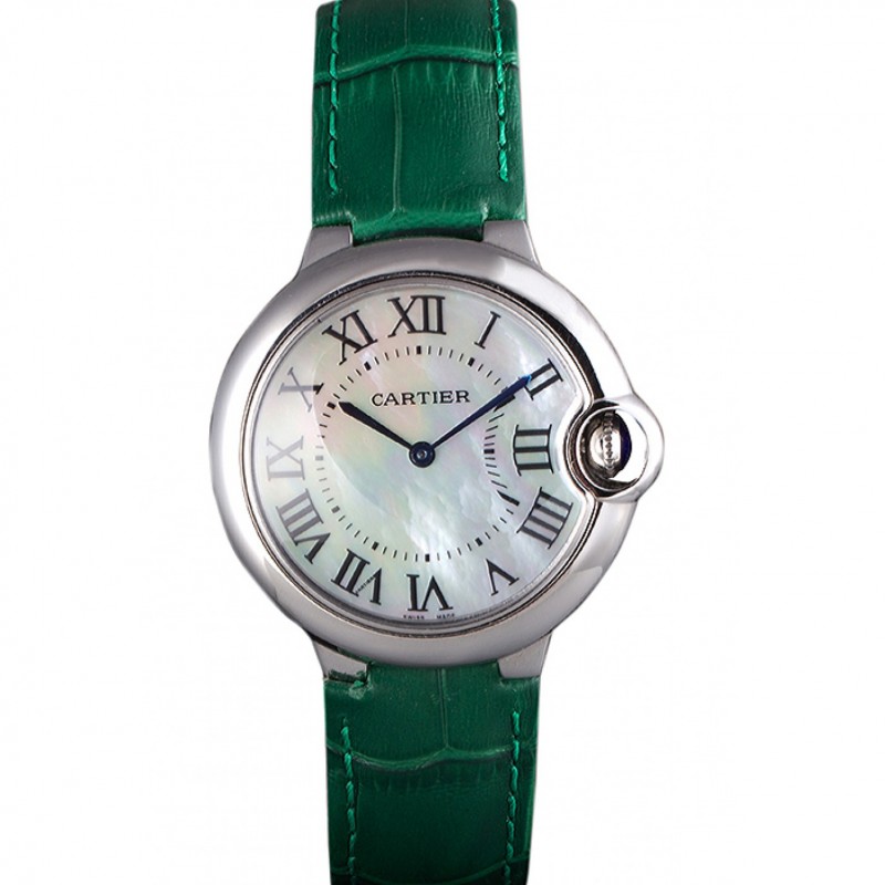 Gama alta Réplicas Relojes Cartier Ballon Bleu bisel plateado con la línea de perlas banda de cuero verde 621552