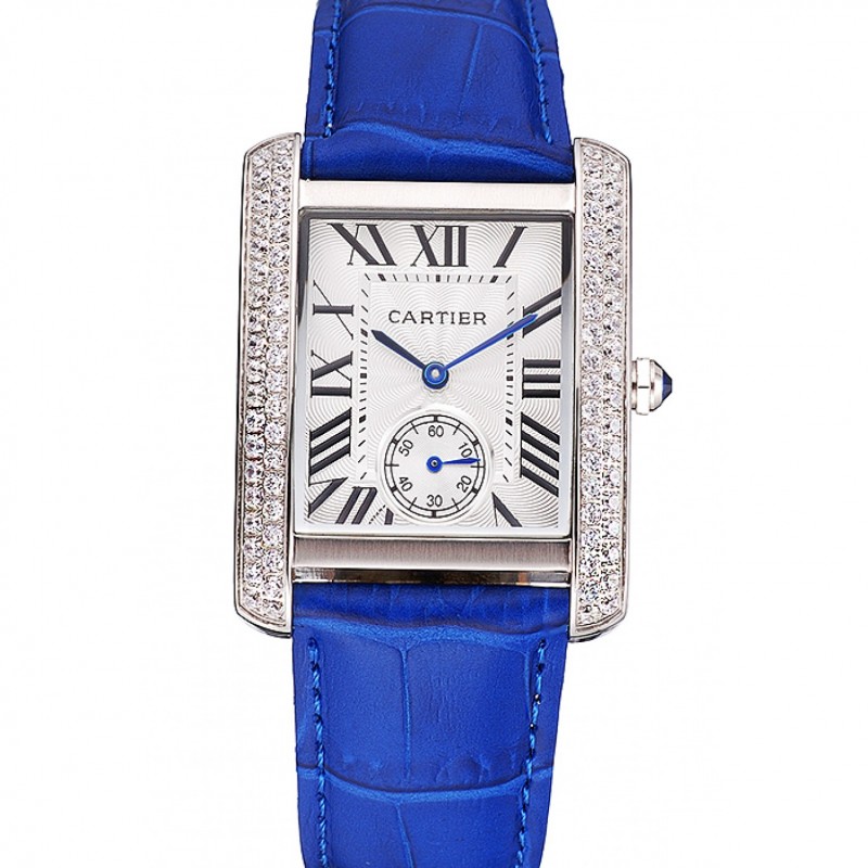 AAA Réplicas Relojes Cartier Tank MC diamante del acero inoxidable Caso Blanco Dial correa de cuero azul 622172