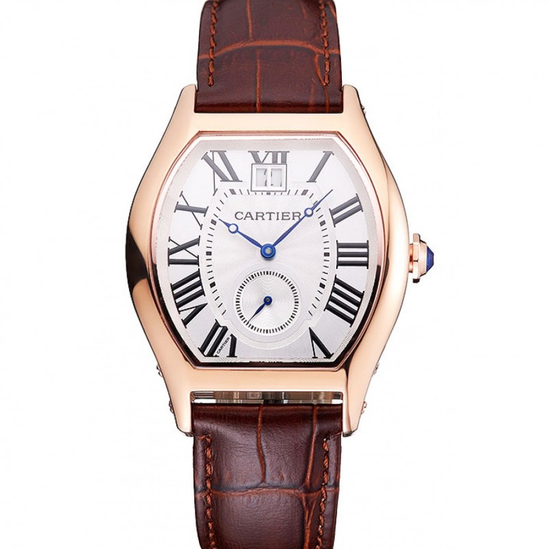 Cartier Tortue grande Fecha Esfera Blanca, Correa De Cuero Caja Oro Brown