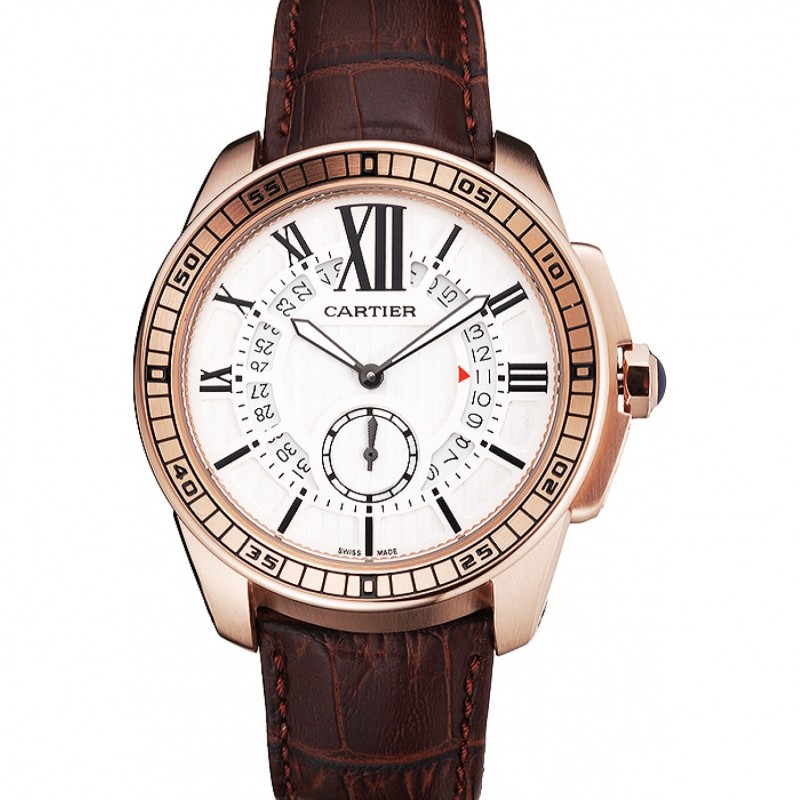 Cartier Calibre De Cartier pequeños segundos Blanco Dial correa de cuero de la caja de oro rosa Brown