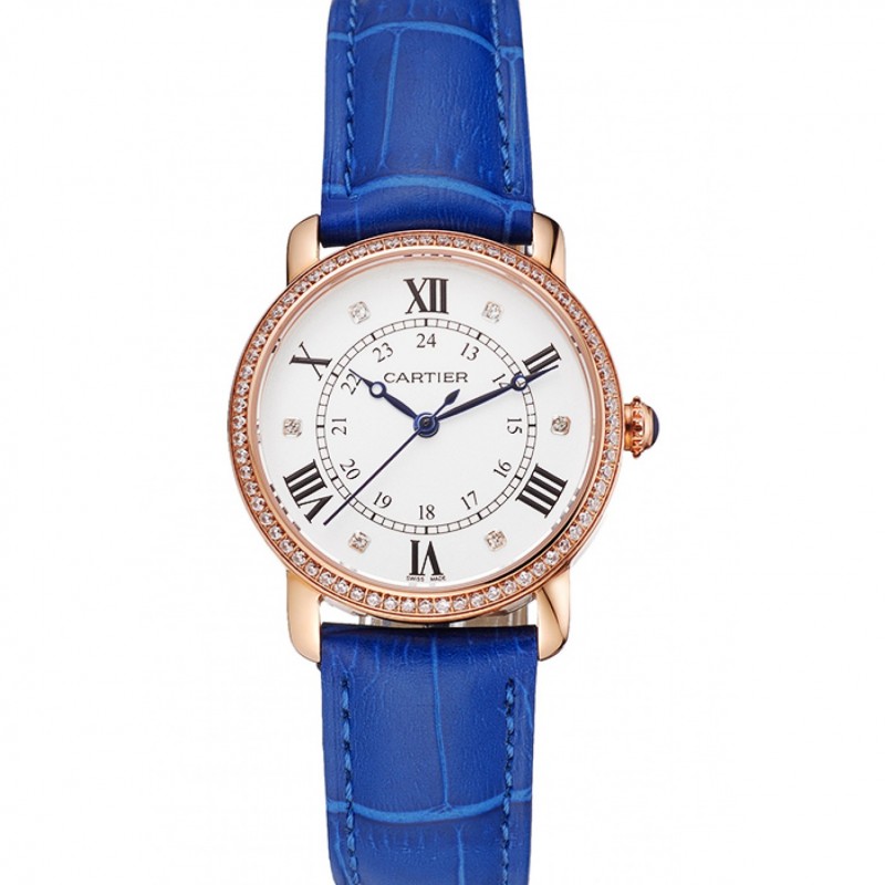 Cartier Ronde Blanco Dial correa de cuero del diamante del bisel de oro rosa caja azul