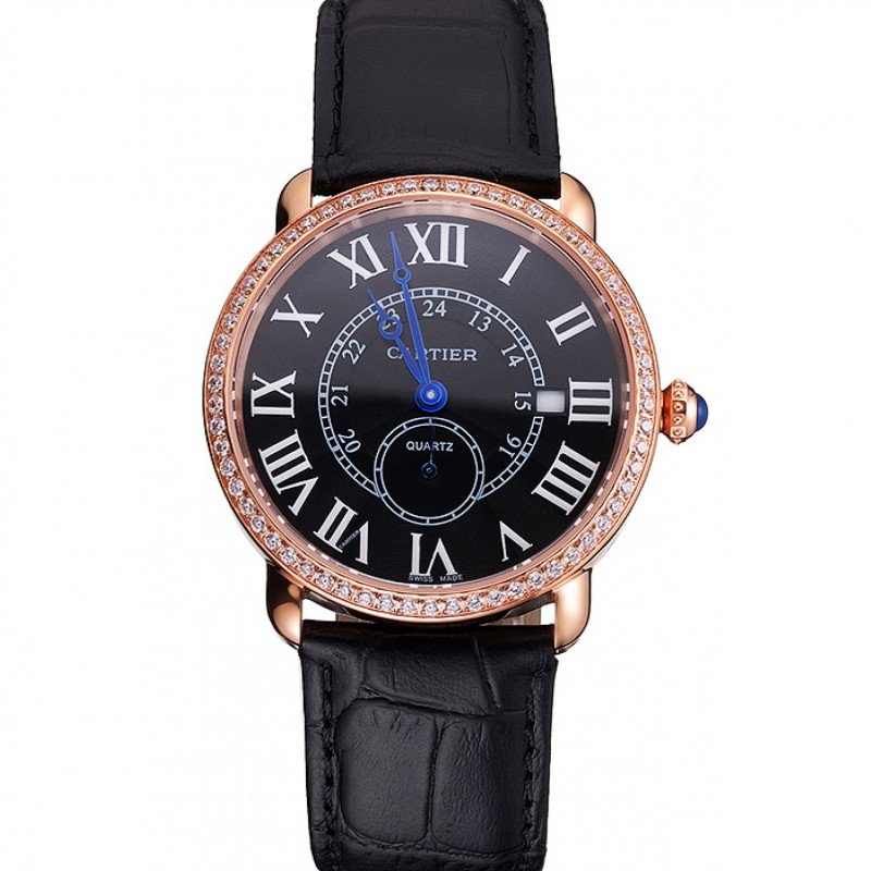 Gama alta Réplicas Relojes Cartier Ronde Louis Cartier Negro Dial correa de cuero Bisel De Oro Diamante Negro