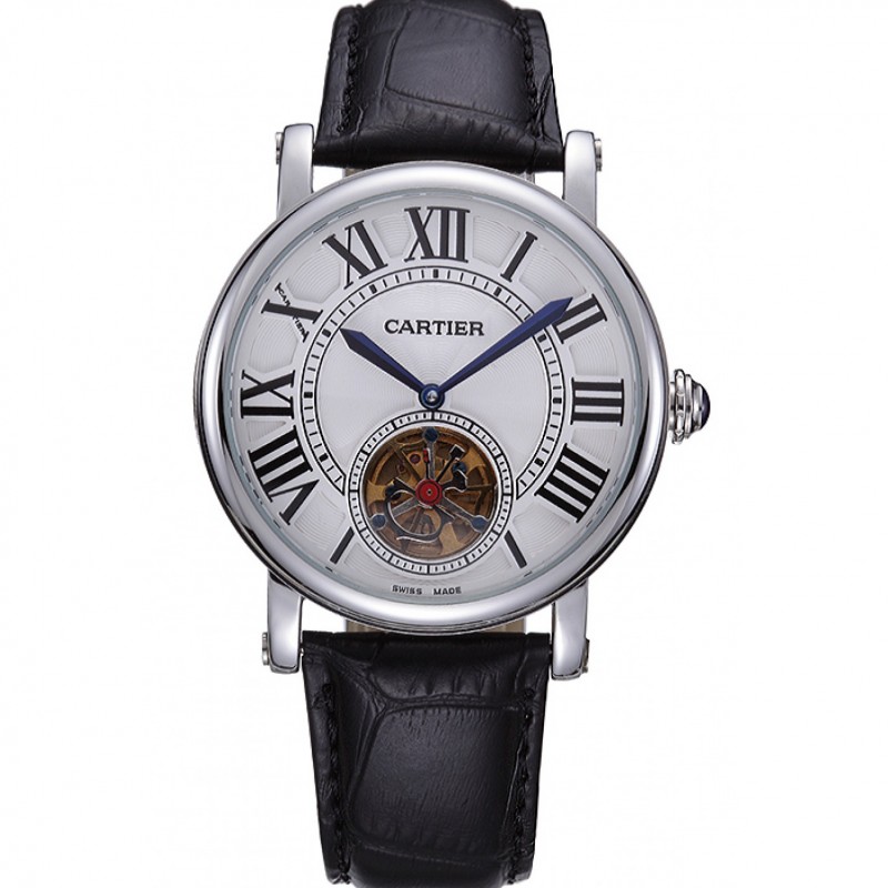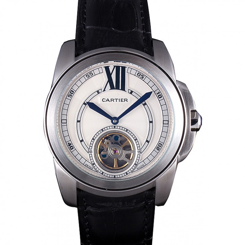 Gama alta Calibre Cartier Flying Tourbillon esfera blanca de la pulsera de cuero caja de acero inoxidable Negro