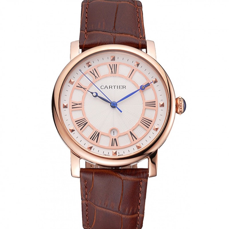 Cartier Rotonde Fecha esfera blanca correa de cuero de oro rosa caja Brown