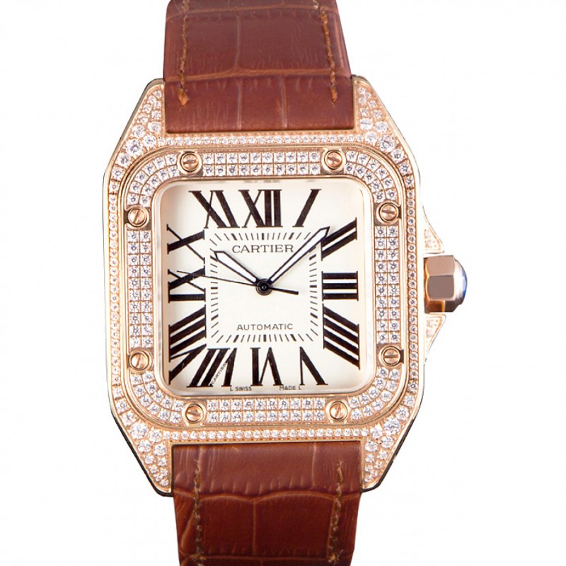 Suizo Cartier Santos de oro rosa Bisel con Diamantes y Correa de cuero marrón sct46 621530