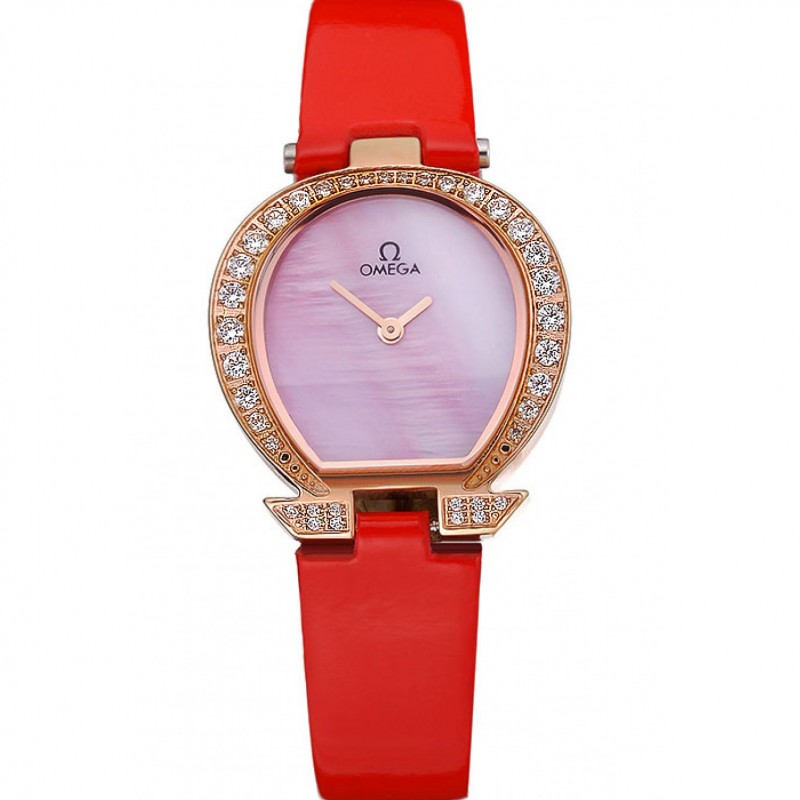 Omega señoras reloj de oro rosa Dial Caso con correa de diamantes de cuero rojo 622831