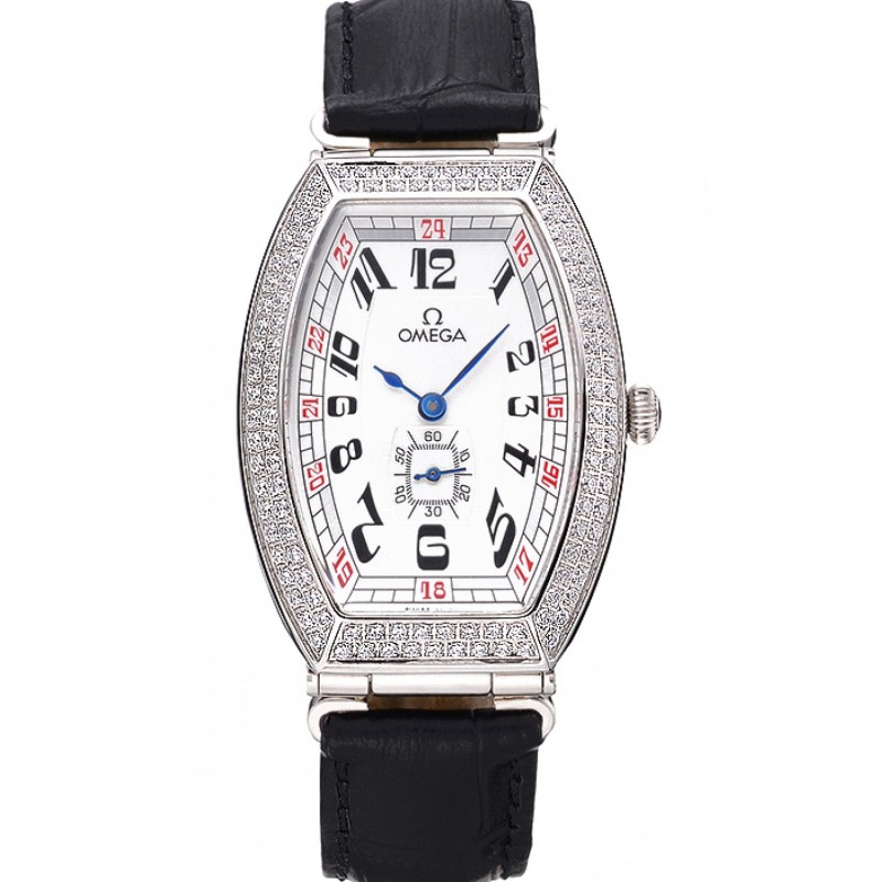 Omega Sochi Petrogrado esfera blanca con diamantes caja de acero inoxidable Negro correa de cuero 622823