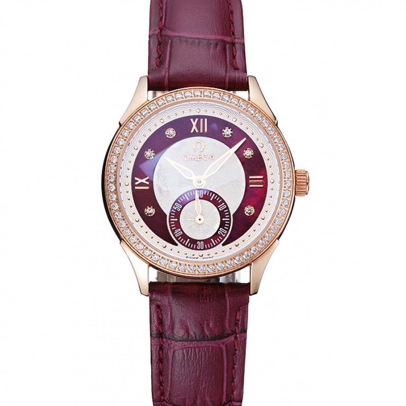 Omega DeVille Prestige rojo oscuro Dial de Oro caja del diamante rojo oscuro pulsera de cuero 1454125