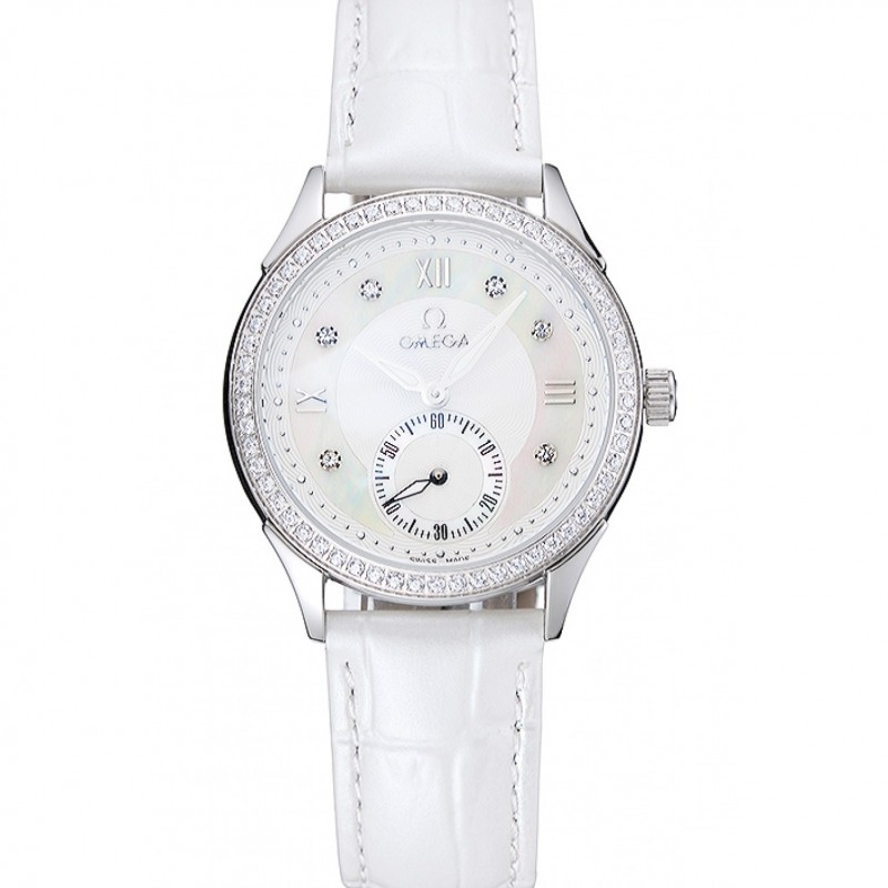 Mejor Omega DeVille Prestige Blanco Dial de plata diamante Caja blanca de la pulsera de cuero 1454119