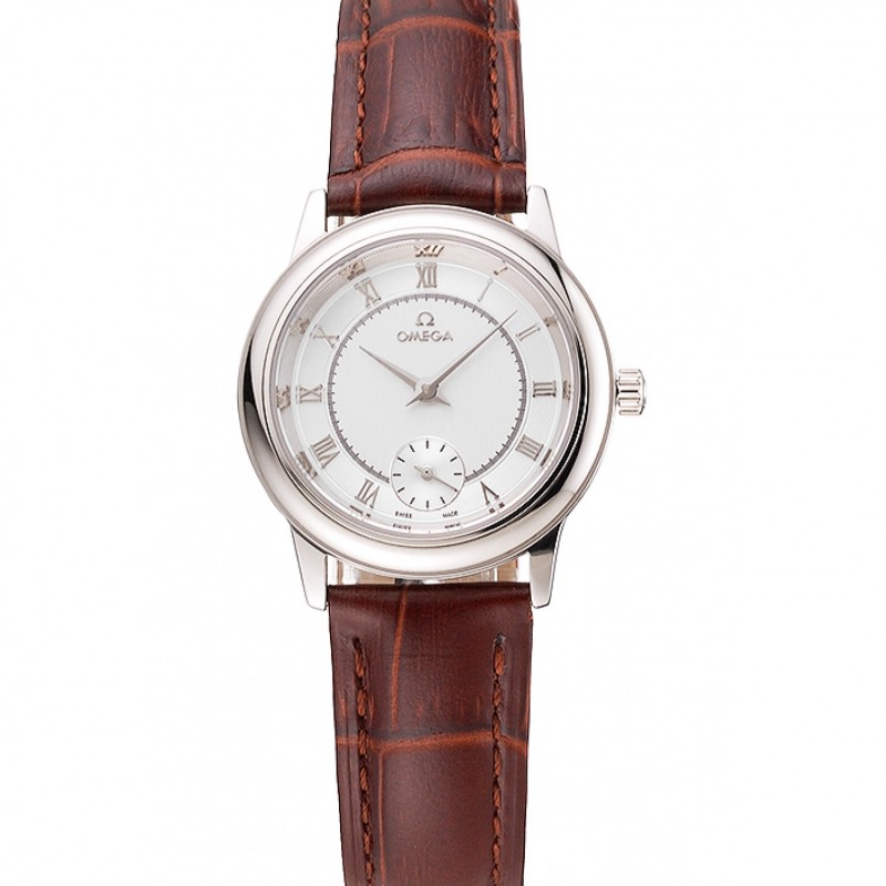 SS Réplicas Relojes Omega De Ville Prestige pequeños segundos Silver Dial correa de cuero caja de acero inoxidable de Brown