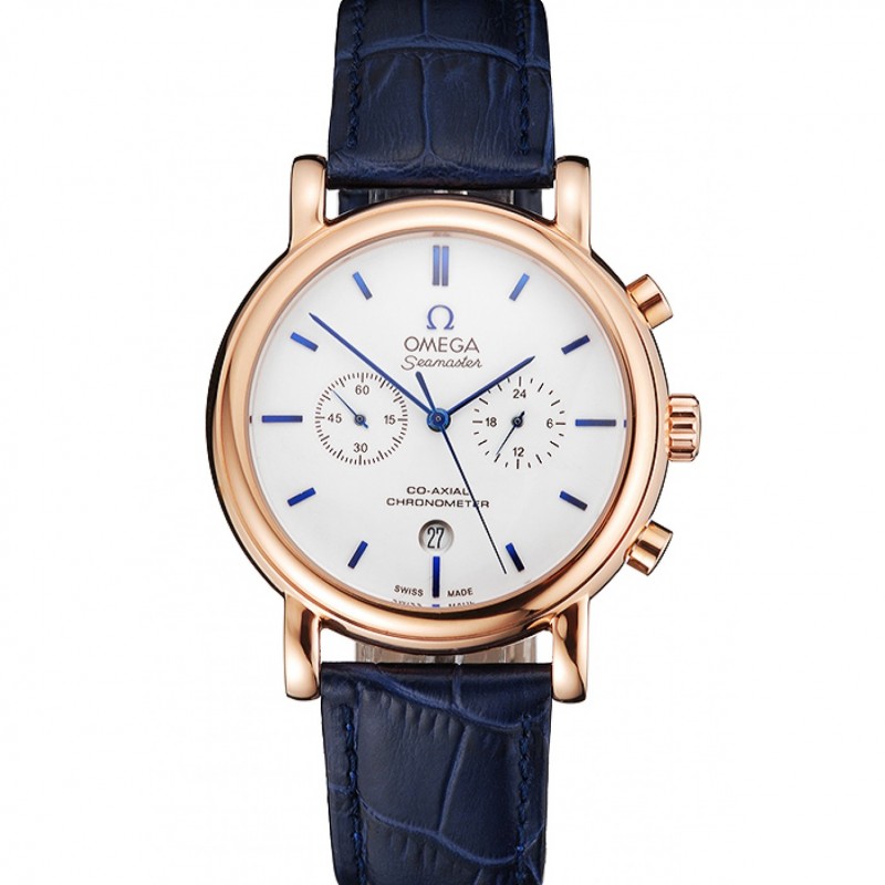 Omega Seamaster de la vendimia del cronógrafo Esfera Blanca, Correa De Cuero Marcas Hora Azul Caja Oro Rosa Azul