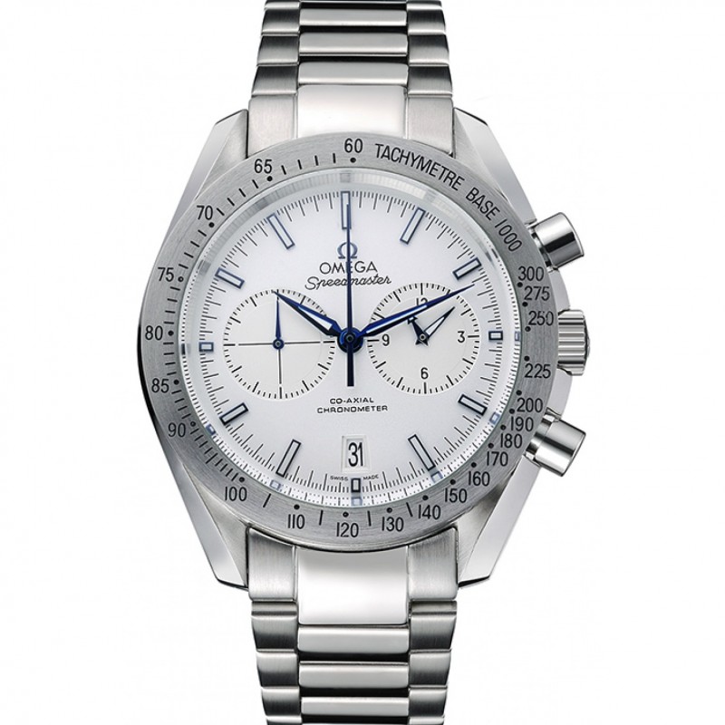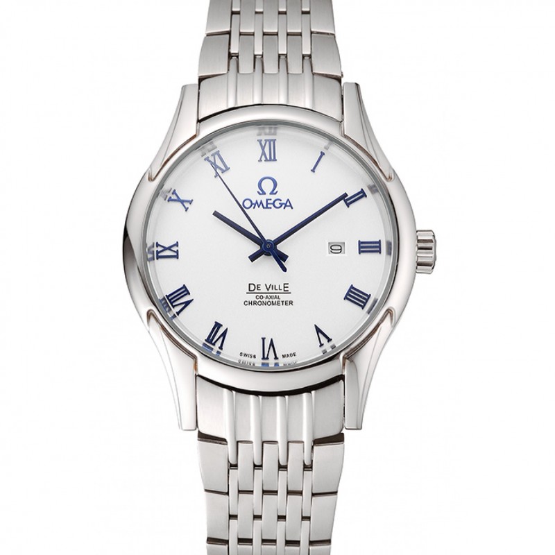 Lujo Omega De Ville esfera blanca numerales azul caja de acero inoxidable y pulsera 1453787