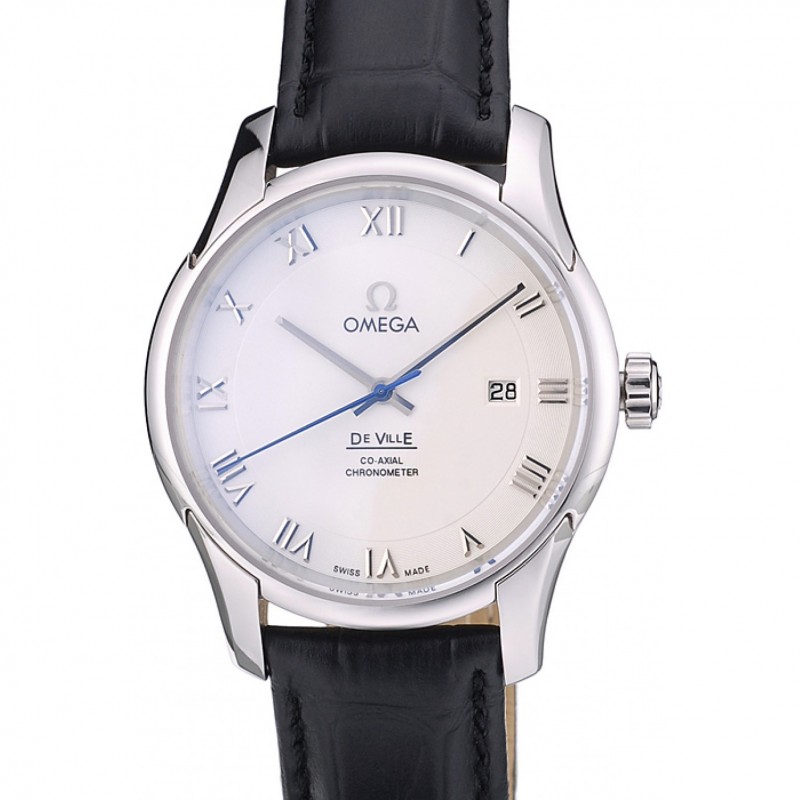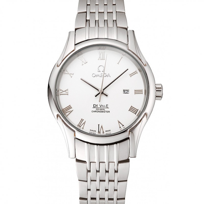 Gama alta Omega De Ville Esfera Blanca Caja de acero inoxidable de los números romanos y pulsera 1453791