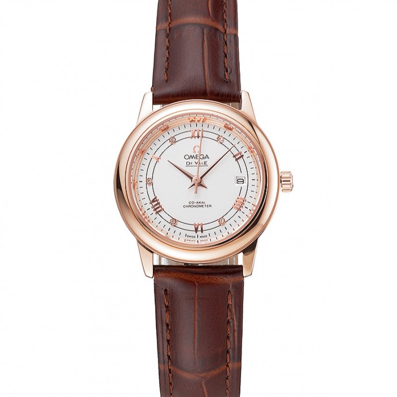 SS Omega De Ville Prestige Damas Blanco Dial correa de cuero de la caja de oro rosa Brown
