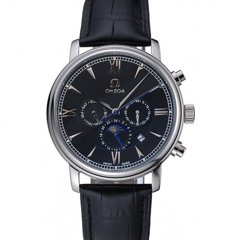 AAA Omega De Ville Fase Lunar Negro Dial Caso Negro de plata pulsera de cuero 1454225