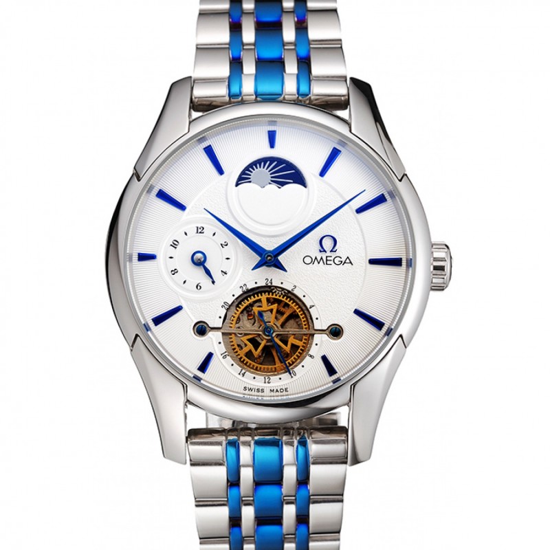 Omega De Ville Tourbillon Fase Lunar Blanco Dial Caja de acero inoxidable Dos pulsera de acero azul de tono