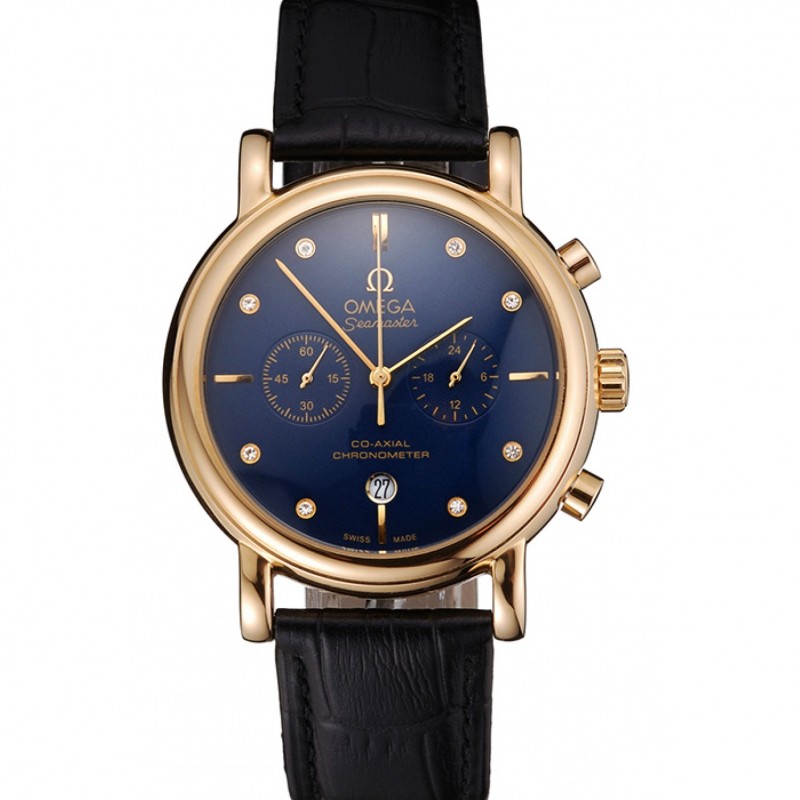Barato Cronógrafo Blue Omega Seamaster de la vendimia Dial correa de cuero del diamante marcas de la hora Caja Oro Negro