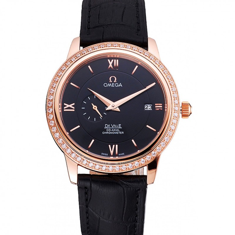 Omega De Ville Prestige Co-Axial Negro Dial correa de cuero de oro rosa caja del diamante Negro número romano