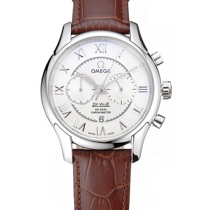 Lujo Omega DeVille bisel plateado con esfera blanca y correa de cuero marrón 621566