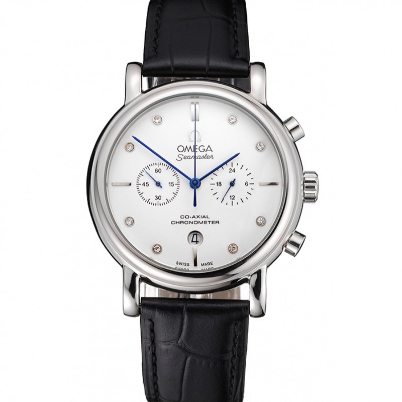 Cronógrafo blanca Omega Seamaster de la vendimia Dial correa de cuero Hora diamante Marcas caja de acero inoxidable Negro