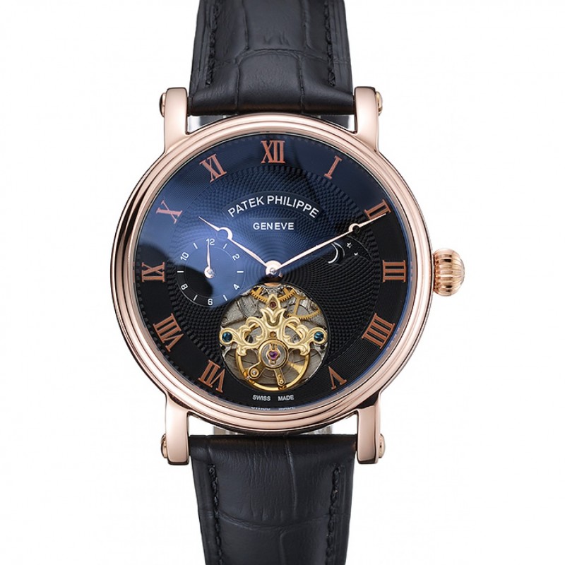 Las complicaciones Fase lunar Patek Philippe Tourbillon Negro Dial correa de cuero de la caja de oro rosa Negro