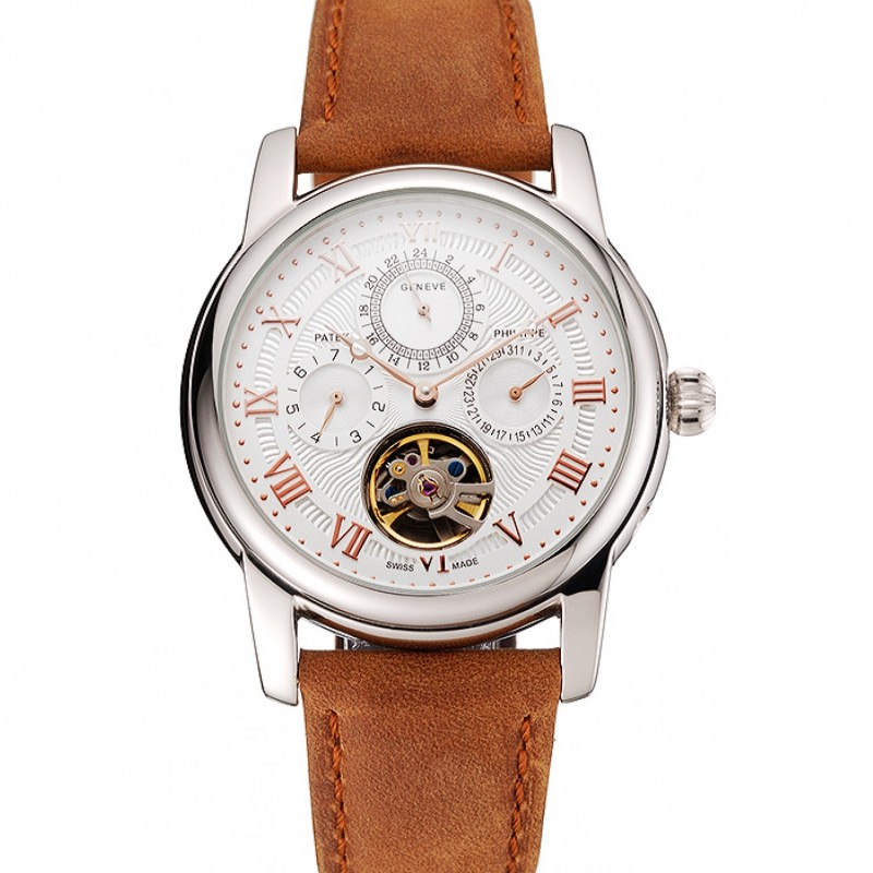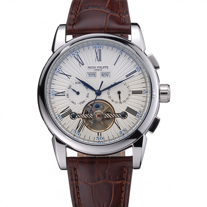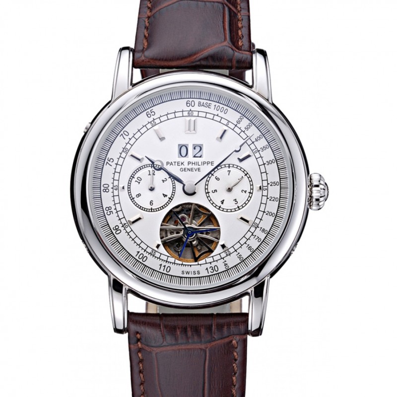 Patek Philippe clásico Tourbillon De Reserva Blanco Y Negro Dial correa de cuero caja de acero inoxidable de Brown