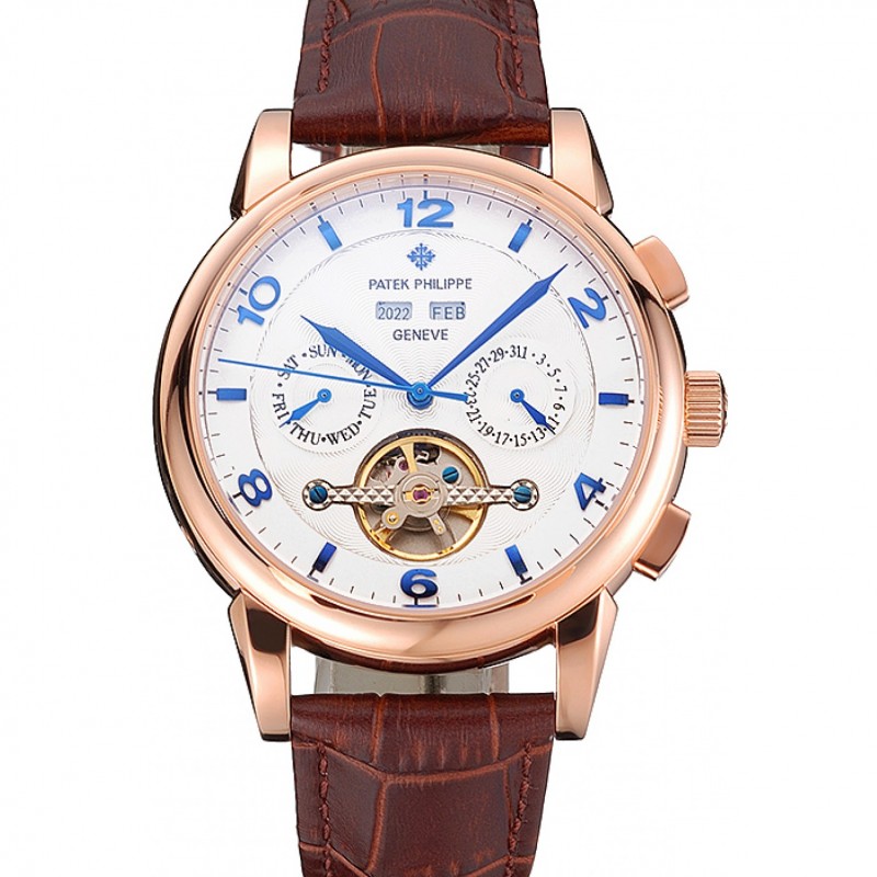 AAA Réplicas Relojes Patek Philippe Calendario Perpetuo Tourbillon esfera blanca correa de cuero de la caja de oro rosa Brown