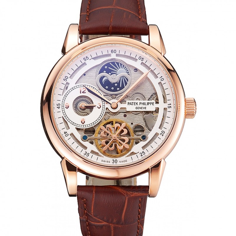 Gama alta Réplicas Relojes Patek Philippe Tourbillon Tiempo doble Fase lunar negro en esqueleto Dial correa de cuero de la caja de oro rosa Brown