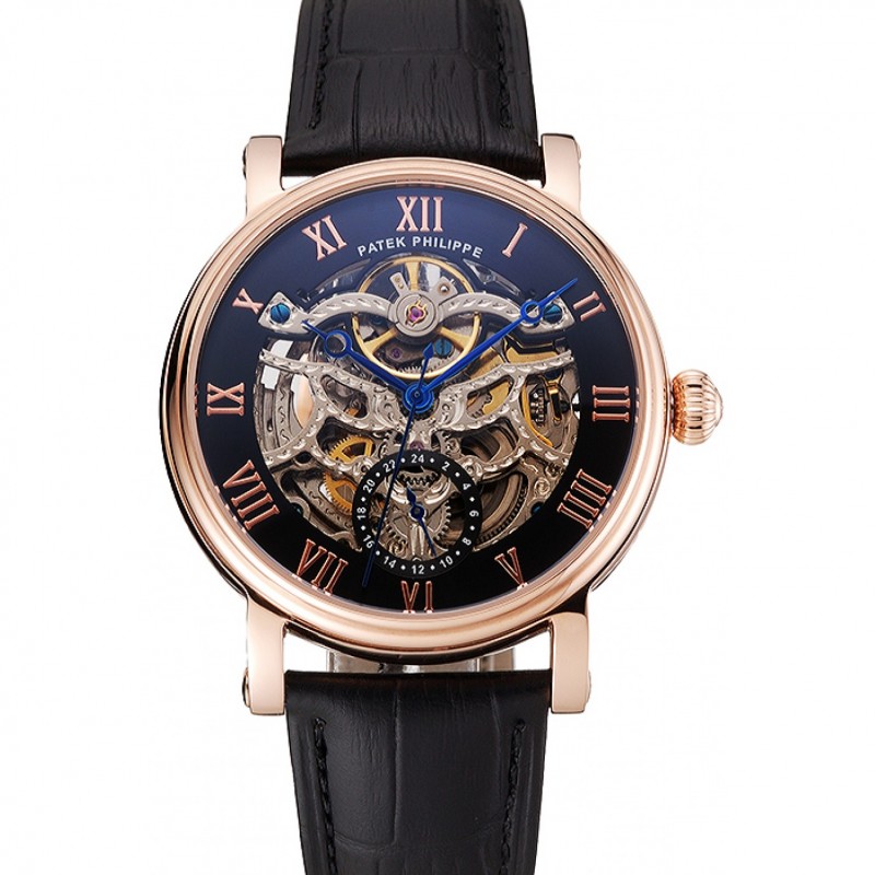 Patek Philippe Grand complicaciones Negro Dial Esqueleto de oro rosa Caso Negro correa de cuero 1453809