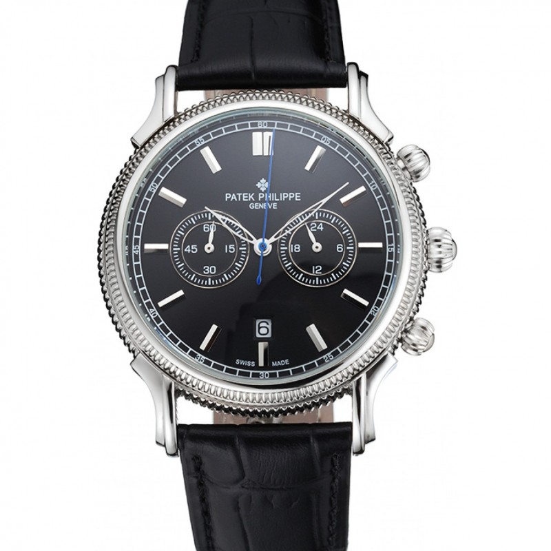 Gama alta Patek Philippe Cronógrafo Negro Dial correa de cuero caja de acero inoxidable Negro