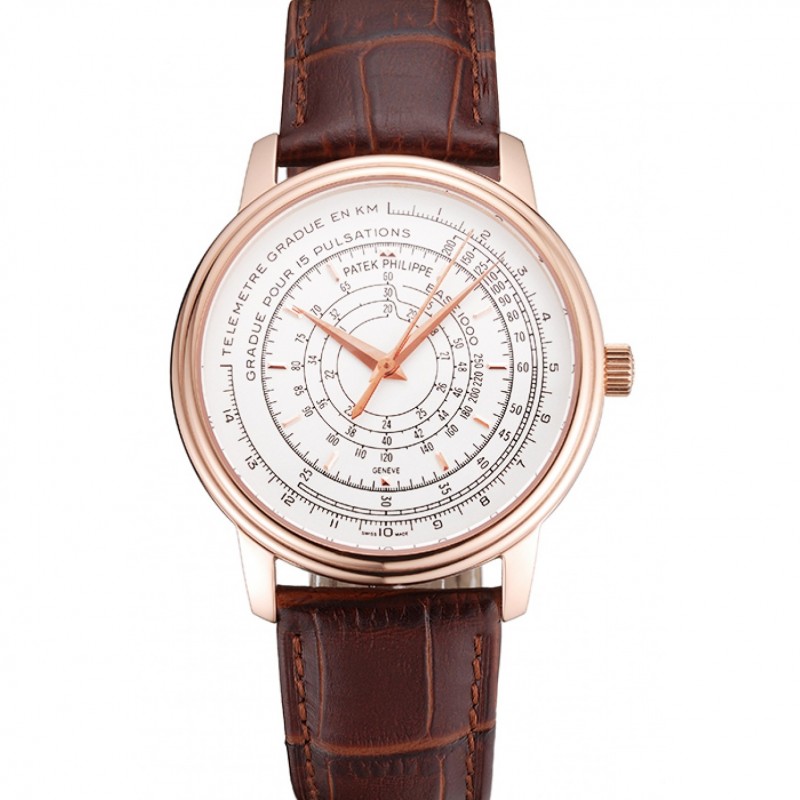 Suizo Patek Philippe Multi-Scale cronógrafo esfera blanca correa de cuero de oro rosa caja Brown