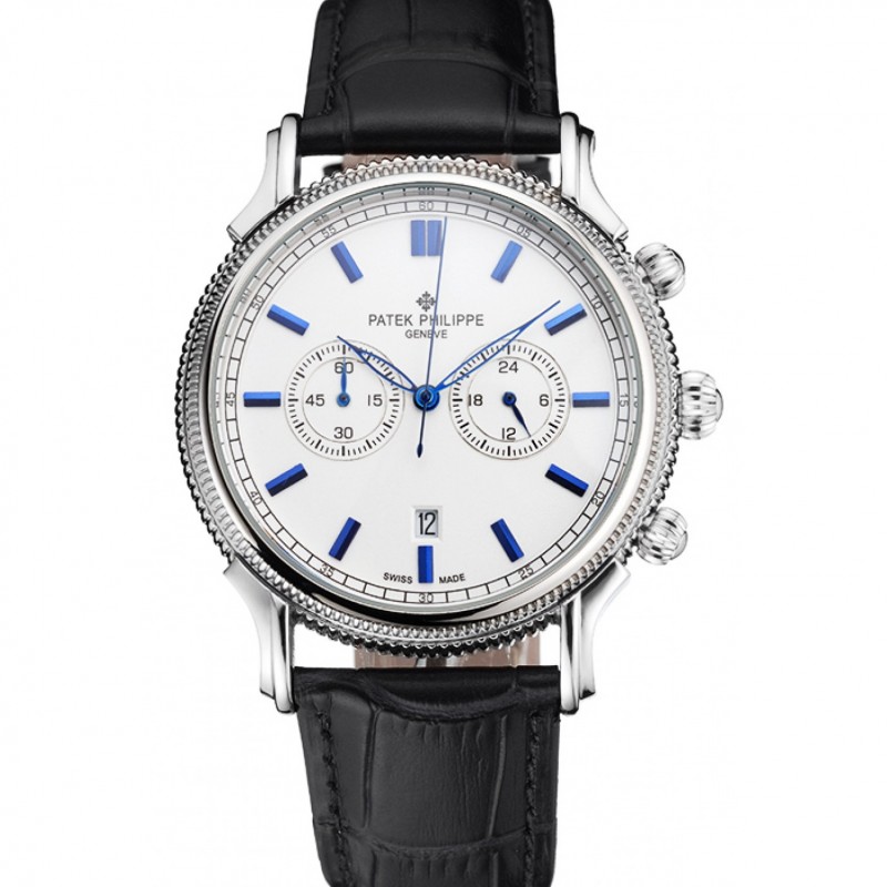 Patek Philippe cronógrafo Esfera Blanca, Correa de cuero azul Marcas caja de acero inoxidable Negro