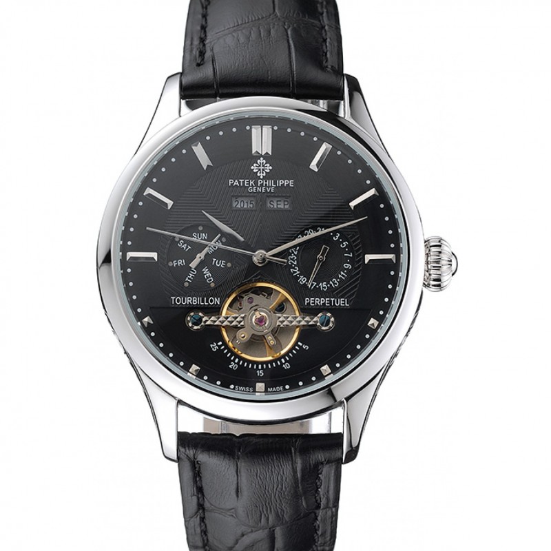 Patek Philippe Día Fecha Tourbillon Dial Negro Caja de acero inoxidable Correa de cuero Negro 622839