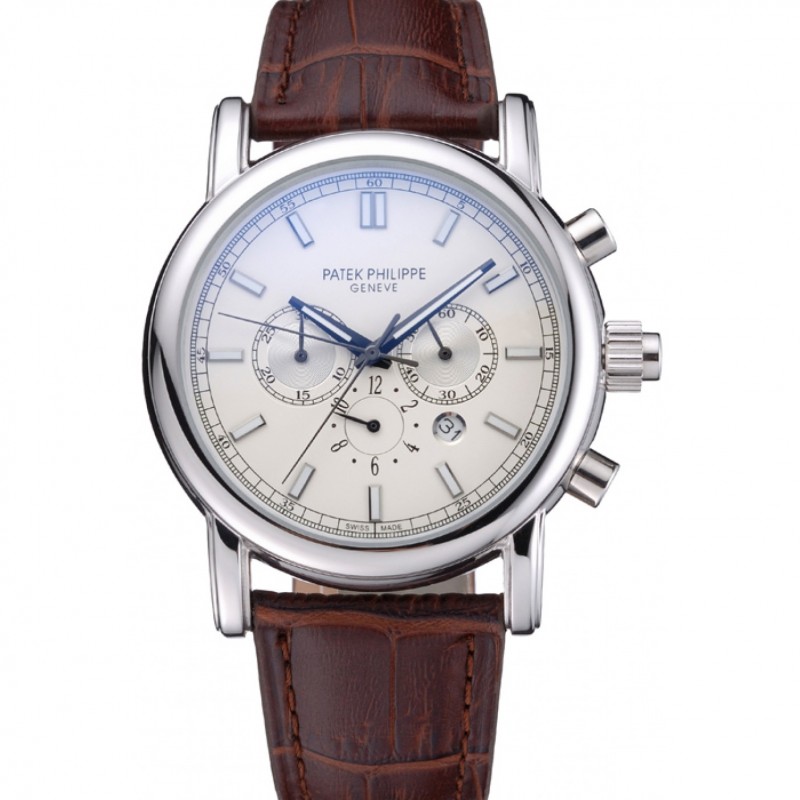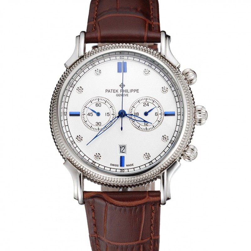 Mejor Patek Philippe cronógrafo esfera blanca con el diamante y la correa de cuero azul Marcas caja de acero inoxidable de Brown