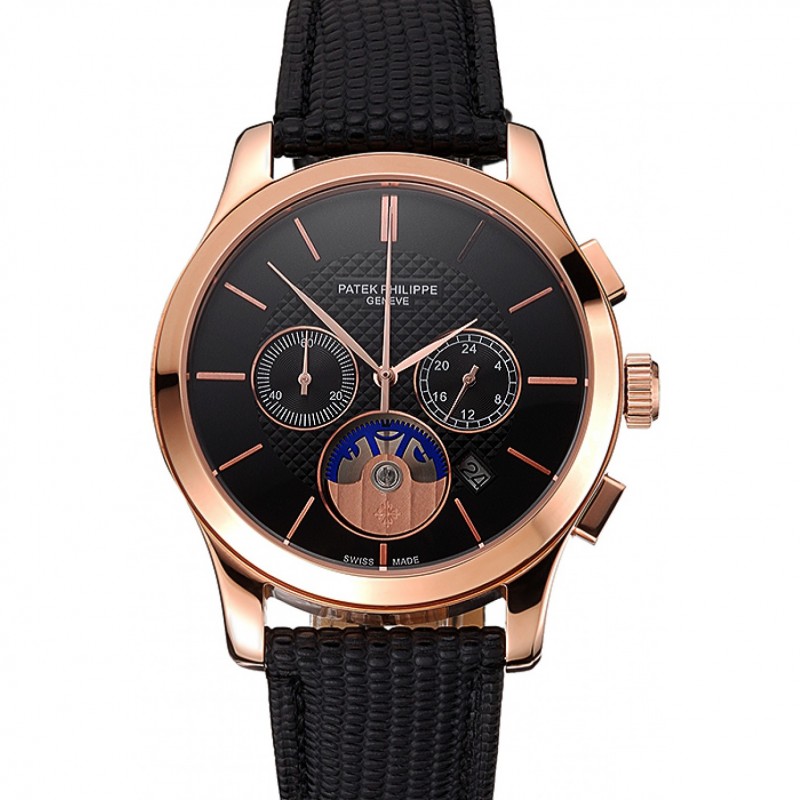 Lujo Réplicas Relojes Patek Philippe Cronógrafo Negro Dial correa de cuero de la caja de oro rosa Negro