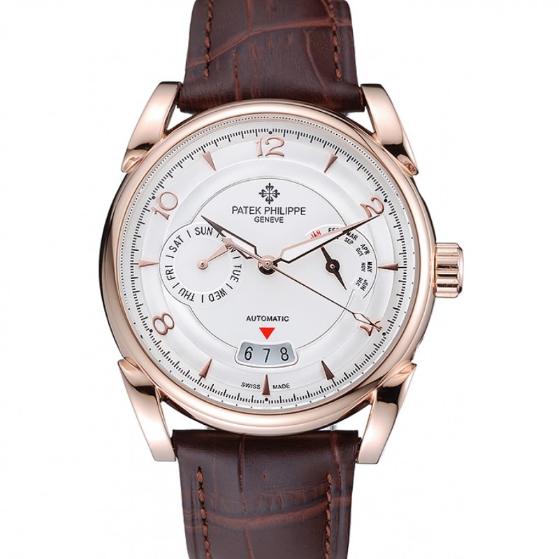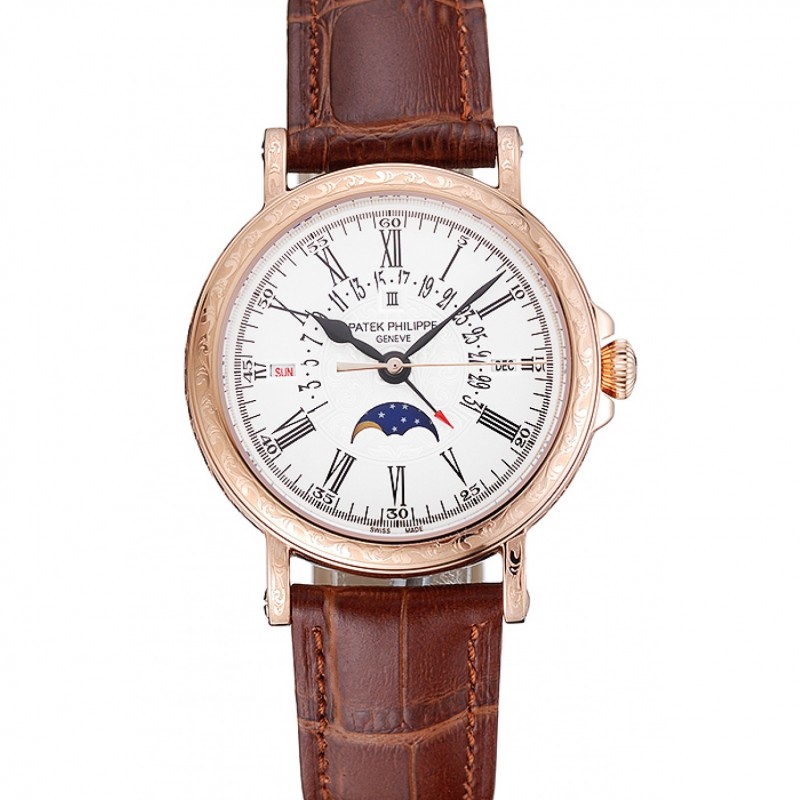 Barato Patek Philippe Calendario Perpetuo retrógrada Fecha esfera blanca pulsera de cuero grabada de oro rosa Marrón: 1454148
